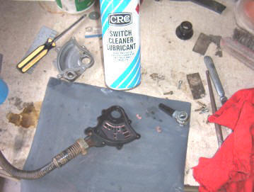 Replace the grease with dielectric or lithium grease but do not go over board with it. Just a smear as shown is enough. Re-assemble the contacts back into place and don't forget the two springs used under the contacts in the wiper arm and that they move freely under the spring pressure. Place the NSS back onto the shaft with the bolt and nut loosely. Pull the cable back up with the string you left in place and reconnect. You can line it up as shown above to align the NSS or just simply turn the ignition until the warning lights come on, and then select reverse. If the reverse lights come on and you can still start the engine in only Park and Neutral, you have it perfect and can tighten down the bolt and nut and bend the tabs over.