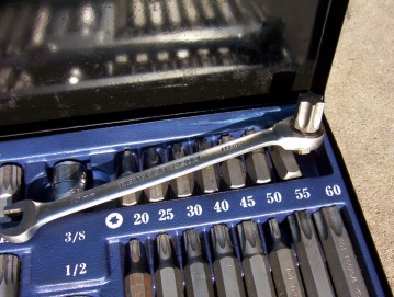 Now some people and shops claim you need a very special tool to remove the adaptor but that is not the case at all. Just need a Torx set like shown and fit a ring spanner directly to the torx bit. Then there is enough room to the between the oil adaptor and the inside of the body work. Then just simply screw the retaining piece out. They can be tight so may require a tap from the mallet or a tube over the end of the spanner to get the extra leverage needed. Some earlier Jeeps need a 9/16" Allen key instead using the same technique.