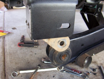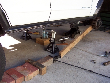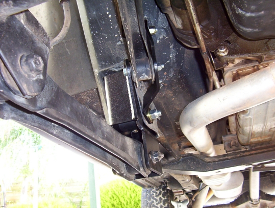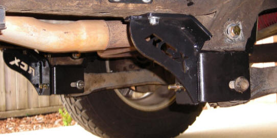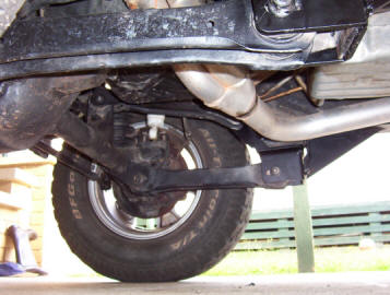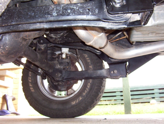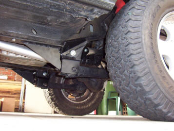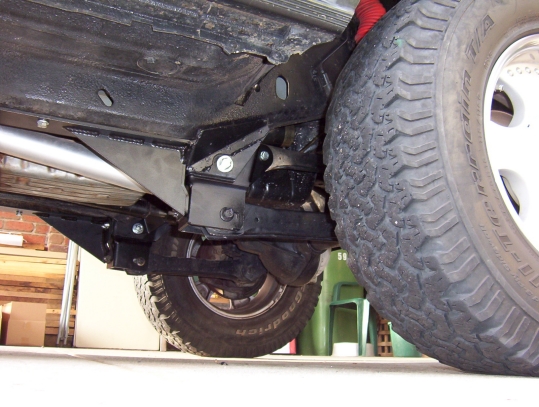 You will find most likely that the axle has moved backwards making it hard to refit the control arms. I rigged up the contraption above using the stock bottle jack to push the axle exactly forward. Once you have one of the arms in place, push the bolt home and then you can still use the jack to help align the other bolt. Still leave the bolt loose until both arms are in position. You can then do up the arm bolts and then the remaining bolts. There will be some pulling on the outer brace to get it to sit flat so keep going over the other bolts that pass through it until you can go over all without moving one of them. This is very important and have heard of them becoming loose if this step was not taken or all of the bolts weren't gone over again after a weeks worth of driving and after the first 4wd trip.