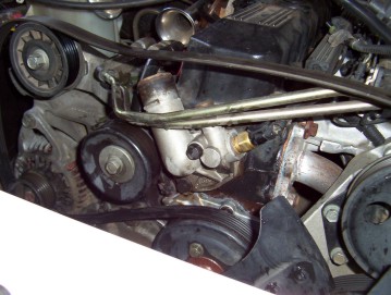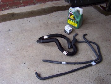 Now is also a good time to back flush the block and heater core. First turn your heater on fully and then remove the heater hose from the thermostat housing and then push you garden hose into that. You want to do it this way as any thing trapped in front of something will be pushed back and out rather than jamming further in. Also blow through the heater hose after the flushing as more water comes out so it can be replace with demineralized water/coolant mixture. As all the hoses were 8 years old now it was safer to replace them as they rot from the inside out. I had noticed that it had started to around where the hose clamps sit so it was just in time. I have kept the old ones for emergency's with the heater hoses placed behind the rear plastic panel in the back above the fuel filler and the radiator ones in my camper trailer. Also changed the radiator cap as well as the thermostat. I and some others have had trouble with stable temperatures after adding this radiator that it would run too cold and back up to normal temp and back to to cold again. Adding a restrictor that I made along with a Stant Superstat Thermostat, #45359, and it is now perfectly stable. The heater hoses are also from the dealer as I could not get aftermarket ones like the radiator ones I used.