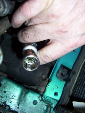 Time to remove the upper and lower hoses as well as the auto cooler lines. The top one is easy as just un-bolts but the bottom one can be a cow. The trick is the use some long nose pliers and squeeze the plastic tags that stick out of the fitting. Now this is the trick the Markus Kramer taught me and that is to first push the hose in hard and then holding the pliers tight, give a sharp pull to pop it off. Might take a few goes but it does work so long as you push it in hard first and then pull back while the plastic ears are held in!