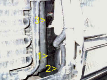 No.1 shows the position of the rubber in place curving from the back of the grill support to the bottom of the intake hole ( No.3 ). No.2 shows the foam rubber forced in to stop air passing past the hole and goes from the bottom of the indicator to the top of the radiator support panel. More was also placed just above the hole under the radiator support panel. I also used some larger foam rubber on the other side to force more air through the radiator instead of slipping past in the gap that was there.