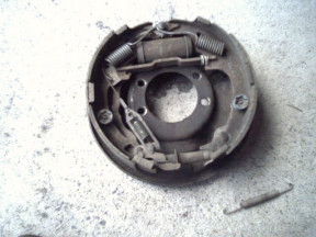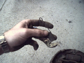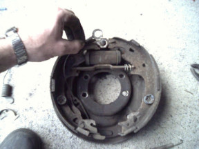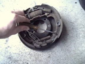 Stretch the spring over the anchor pin with a screw driver using the pin as a lever point as above. Then do the same with the other side as well. Also a good time to make sure that the lever that the hand brake cable attaches too is released all the way. Often the cable is adjusted when it pulls up too high when it fact it is not the cable out of adjustment at all but the brake shoes from wear.