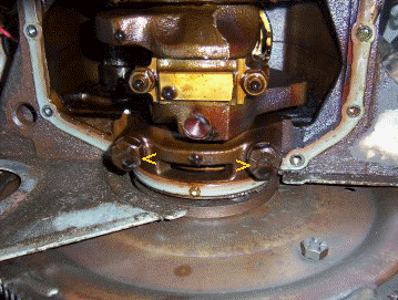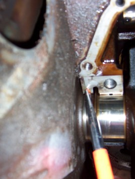 You can start by draining to oil and I did mine the day before to reduce the dripping while working on it. Some remove the starter if you find it is in your way and you cannot get to the sump bolts along side of it. Depends what socket set you are using. Once all the bolts were remove I just gave the sump a sideways hit with a rubber mallet and it dropped right out. The older Jeeps in the USA may have the old cork gasket which can harden over time and make this part hard needing screw drivers or cold chisels wedged in to lever it out. Dropping the steering out of the way will help access if this is the case. Also the more lift you have will make it easier to drop the sump out and jacking up the front by the frame will give more room to drop out the sump past the rear pickup. My sump was nice and clean but clean yours if any build up is in there from using poor quality oil that is not changed regularly or in a cold climate. To remove the lower half of the rear main you only need to take out the last bearing cap by removing the two bolts arrowed. May need a breaker bar to do this. Newer Jeeps will also have a bearing brace that sits over all the bearing caps and needs to be removed first. Then the rear bearing cap can be removed as above.