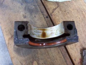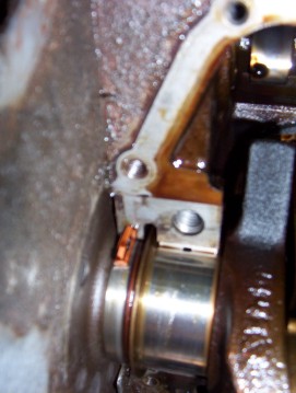 Clean the bearing cap carefully and then place the new seal into the grove in which it sat. On my model at least there was only one way this seal could go in with the lip facing towards the front of the engine as shown. Now place some sealant ( Loctite 518 or similar ) right along where it joins against the block exactly like shown. It needs also to extend forward toward the bolts holes but only in a small bead like shown. Also oil the lip of the seal as well as the bearing surface. Bolt it back into place and torque the bolts up in stages. First 54 Nm ( 40 ft. lbs ) then 95 Nm ( 70 ft. lbs ) and finally 108 Nm ( 80 ft. lbs ). If you needed to remove a bearing brace, replace it and tighten the nuts that hold it in position to 47 Nm ( 35 ft. lbs ).