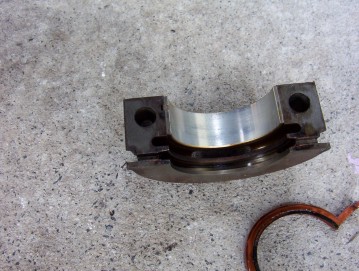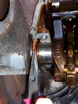 You may need to tap the cap to loosen it. Once out you are faced with above. Just simply remove the old lower half of the rear main seal. I also removed the old sump gasket at this point which just pulled off and needed no further cleaning but older Jeeps will require a good gasket scraper to get the old off or a Scotchbrite wheel on a drill or Dremel was suggest by Mike Straw to work the best.