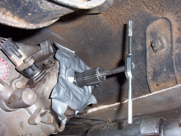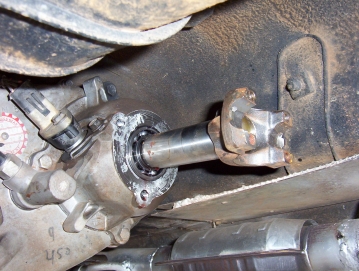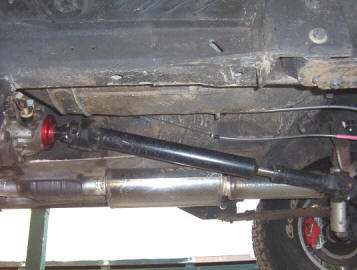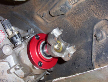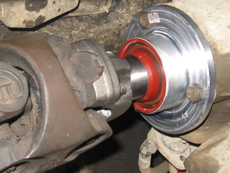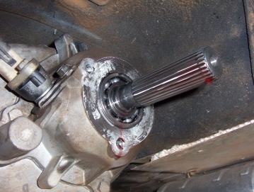 First remove the driveshaft by undoing the four bolts holding the two saddles on at the axle end. Pull free from there and then slide out the drive shaft from the tail cone. Only a small amount of oil will run out. My 95 was the last year for the tail cone that seals the fluid in and it removed by undoing the three bolts holding it on. The pictures show the tail cone removed and then a trail fit of the yoke. If it was not for the need to gain extra length and reduce the leverage, you could fit it now as is.