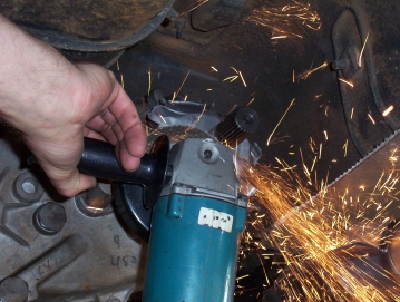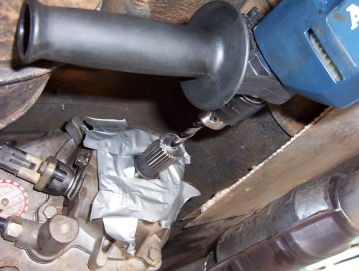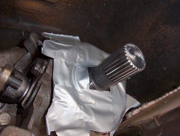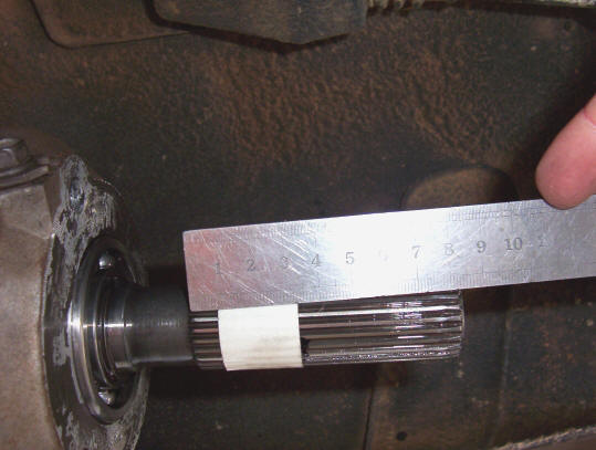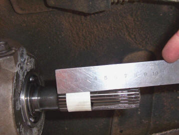 I have placed masking tape around the shaft at 1-1/4" or 32 mm from start on the splines. I then taped up the output bearing so no grit would enter the transfercase. Now I have had to repair shafts that were cut crooked by a well known Jeep shop here. Make sure it is in 2wd and the wheels well chocked. Then start the engine and engage reverse. This will have the shaft spinning while you cut it with a angle grinder with a cut off wheel. This will make sure you have a perfectly square cut as you have effectively made your own lathe. Sounds scary but it is not and the shaft is not spinning quickly at idle.