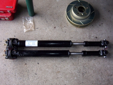 Make sure that thread locker is used on all bolts. I had new driveshafts made for both the front and rear and as you can see, there is little difference between them in length. They are identical in every other way and the front shaft can even be used in the rear to get out of trouble. But this is with my combination that gives you the shortest rear shaft. That is a auto with a D44 ( or 8.25 ) rear axle. Having a manual transmission and or a D35 will leave a front shaft too short. The front driveshaft must also come from a automatic as they are the longest. It does not matter what transfercase as the 231 and 242 are the same length.