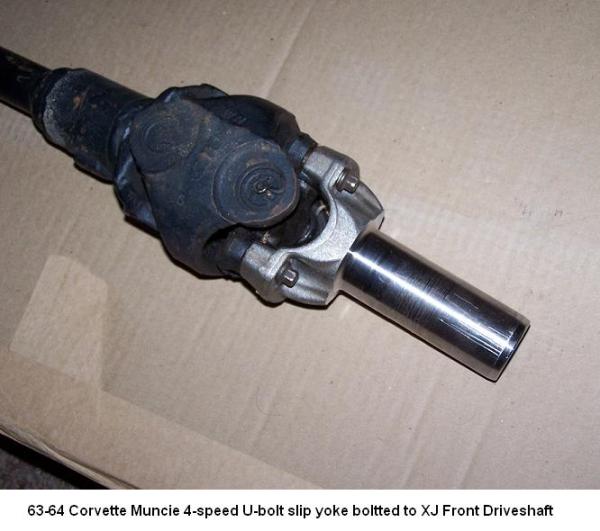 Pictured above is a yoke from a 63-64 Corvette that has a Muncie 4 speed gear box with U bolts. You will need a needle type grease fitting or a non greasable first of the two unis with this yoke though. Thanks to Secshunate from Duncan BC Canada for providing the picture and information. Other suitable yokes are also available from Powertrain Industries part # 3103-27CV and Driveline Service of Fresno which were the cheapest last time. The CV in the part number lets you know it is suited for the correct bolt spacing for the double cardon joint the same as a XJ front driveshaft. Inland Empire Driveline also sell the same yoke, # 3103-27CV, though not listed on their site as do Six States Driveshafts.