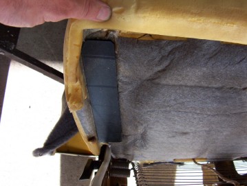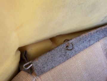 If you look closely at the shot above, you will see the left side of the seat as you are looking at it is a good inch wider past where it should stop at the piping compared to the other side. This is where the foam went after flatting out. Underneath the seat you can see the long clear plastic U shaped piece clipping over a wire support at the edge of the upholstery. Just pull this off the wire with your fingers to remove it from both sides and the front.