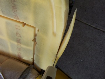 Once you have them all out you can lay back the upholstery as shown as there is no need to remove it completely unless you want to throw it into the washing machine as some people do. To cut away the bulging foam from the door side I found an electric carving knife works really well. Otherwise use a bread knife to do the job.