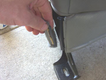 The side piece that cover the frame sides from being seen, just un-clips by pulling back on it away from the seat back. You will now be able to peel back the upholstery about 10". Then to release it further you have to use two pairs of pliers to remove these metal clips by bending them apart. You can see the notches in the groves shown in photos below how many there are. These can either be re-used or just use some zip ties in there place which is much easier.
