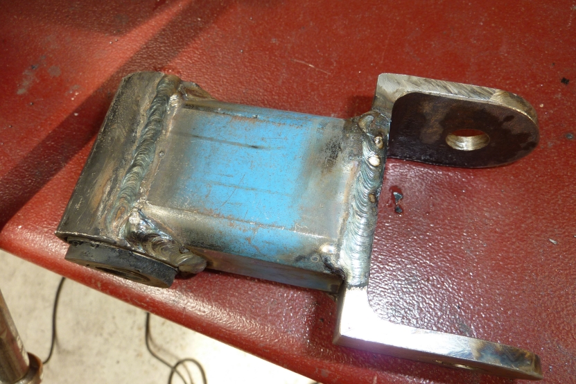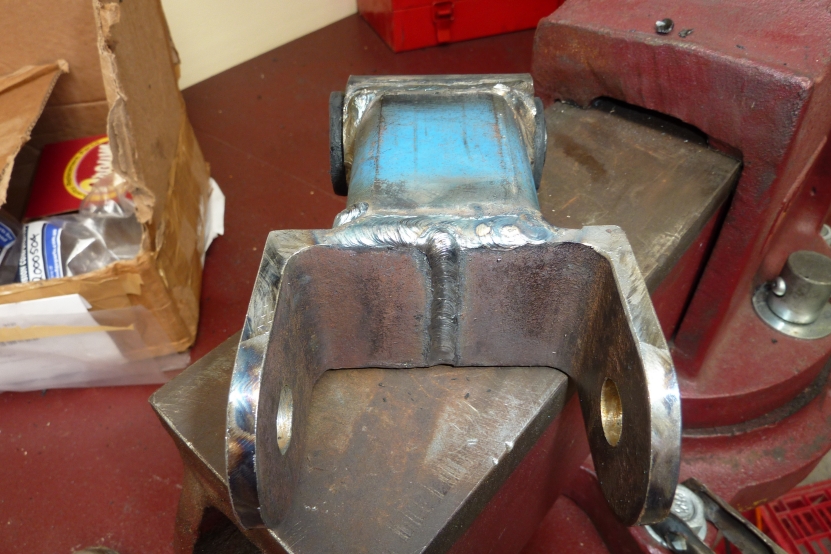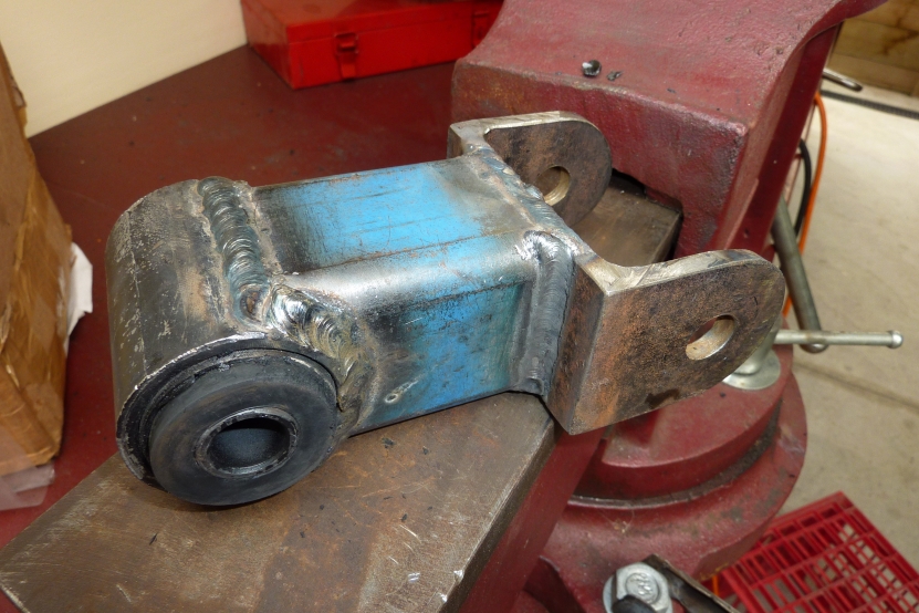 I went for 30 mm longer than the stock 71 mm between hole centres as all I needed to clear the bottom of the re-enforced shackle box and the slight lift in pinion angle I was after without using a shim. Welded it up one weld at a time and cooling it off before the next weld. Bush was undamaged from the heat doing it this way.