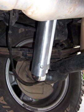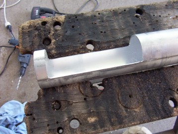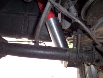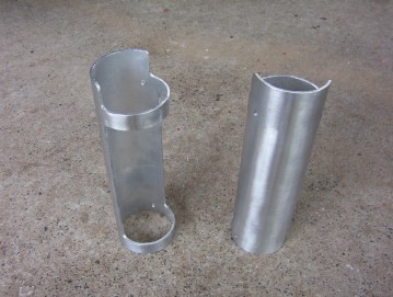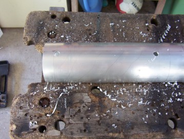 I wont go too much into measurements as every shock is going to be different. I used 3" aluminum pipe with a 1/8" or 3 mm wall thickness so I could clear the adjusting knob on my Rancho 9000's. But you could use less if you have non adjustable shocks. They were cut to go from the bottom of the boot to the bottom of the shock body not including the bush which in my case was 260 mm or just over 10". There are 2 bands left to act as supports and the corners were drilled and then I simply jigsawed the back section out. It pays to keep spaying oil onto the blade to stop the blade getting from getting clogged up.