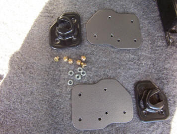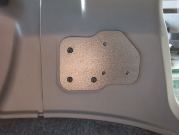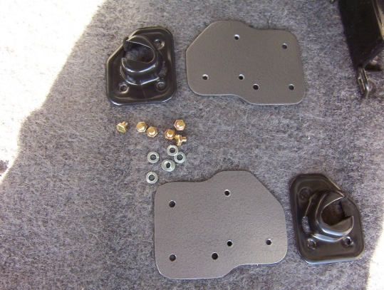 The plates were cut from 1/8" steel which is far thicker than what the inner body pillar is made from. There is not enough clearance for thicker plate but it is well suited to the job needed for it. The three holes were shifted 55 mm or 2-1/8" forward and 12.7 or 1/2" up at the same time. The three holes for the bracket were tapped to suit 1/4" UNF high tensile bolts. These are a size up from the originals and were cut flush with the back of the plate.