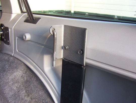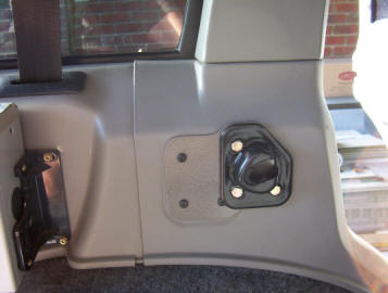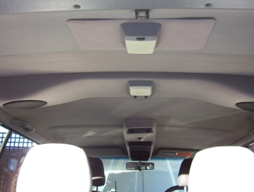 Another thing that was needed to clear the taller tyre was the sound bar. What I did with this is move it forward to just in front of the upper seat belt mounts. Worked out well as there is a roof support there that I could screw the light fitting into which also holds up the centre of the sound bar. I used my old centre light from before I fitted my roof console so now have map lights as well for the rear passengers. The wiring was just extended but also split so the old light still had power. This was mounted on top of a thin metal plate to cover the the large hole in the headlining left and covered in material taken from a sun visor out of another Cherokee at the wreckers. I was just able to use the standard retaining rod with the bracket design I came up with to hold the wheel in place.