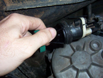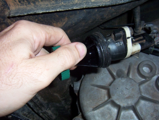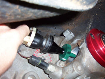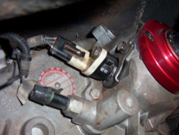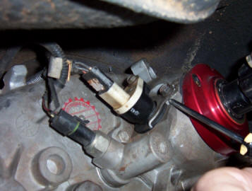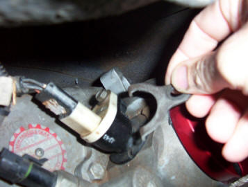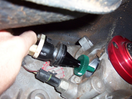 The Speedo gear housing is located on the left side of the transfercase on the side of the extension housing the rear output shaft comes out of. It is simply a matter of removing one bolt ( 1/2" socket ) that is pointed to with the screw driver which releases the metal fork holding it as shown in the next picture. Also take note of the numbers on the side of the housing directly above the bottom fork groove. The gear that you are taking out will be within that range. More on it later.