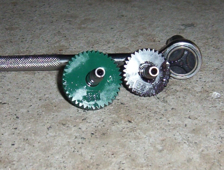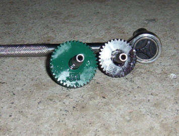 With the fork off, you pull it straight out. The gear itself is now removed by just grabbing a hold of the toothed part and pulling it free. You then just push the new gear in its place making sure it is all the way in ( you will feel it clip in place ) and none of the metal shaft is showing. Before replacing it you need to be aware of the position it must sit in to suit the new tooth count. There are three positions the Speedo housing can fit for a range of tooth gear numbers. This is because the more teeth, the bigger the gear and vice a versa as you can see that below with the green one having 39 and the black one 32 teeth. So that they all still mesh with the drive gear inside, the gear sits off centre in the housing and rotating it moves the Speedo gear ( driven gear ) closer or further away. The three positions are 26-31, 32-38 and 39-41 teeth. These ranges are moulded into the side of the housing and I have highlighted them in silver with the right photo above showing the 26-31 tooth range.