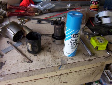 As you can see in the background, the two bolts are quite long that keep it all together. Separate into the three sections shown so that the clean up can begin. I used CRC Switch Cleaner Lubricant which works very well.