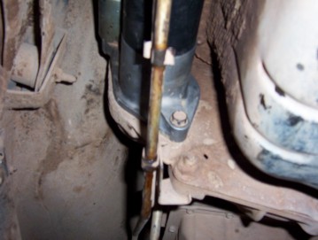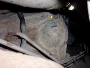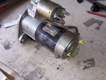 The first thing to do is disconnect the battery as the cables on the starter are live and you don't want them arcing out on the body work. Then disconnect the cables from the starter itself. Once that is done you are free to remove the starters two bolts. There is one in the front of the bellhousing as shown above left, the other larger bolt is at the back of the bellhousing, ( arrowed ).