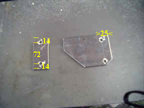After splitting the bracket I cut off the original mounting tabs as shown. Next 5 mm plate 100 mm wide was used for the mounting brackets. The short one was cut 50 mm long and will go under the swaybar bracket on the steering box side to keep it level when the longer 150 mm one is added to the other side. The holes were drilled exactly at 10 mm so there would be no slack with hole spacing from top to bottom being 14/72/14 mm and 25 mm in from the end on both pieces. The corners were cut off to clear the skid plate mounts.