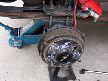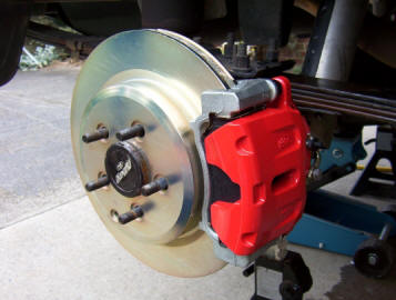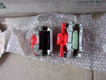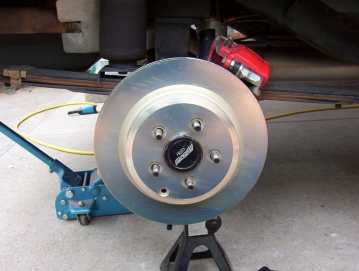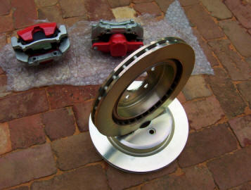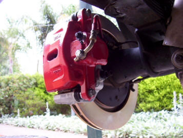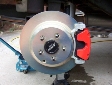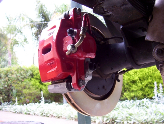 You can see the old caliper still attached to the brake line sitting on the spring in readiness. The new much bigger caliper in size and bore has been bolted into place.