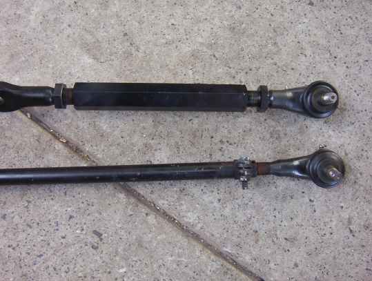 The drag link is shorter though than the tie rod it replaces. To get around this I had a longer adjustment collar made up out of CrMo hex bar by Cheezy Racing. They were threaded with a metric 22x1.5 mm RH thread for the drag link side, and a LH thread for the tie rod end side. Remember that for some reason these threads are metric on the drag link but imperial on the original tie rod? It works out that you need around twice the length of the 5" stock adjustment collar to around 10" long in total. I also had some jam nuts made to lock the collar in position. You could also get two stock adjustment collars and insert a solid bar partly into each living a gap between the collars so you can weld each all the way around to the bar connecting them. Also drill some holes in each collar end to plug weld to the bar inserted inside.