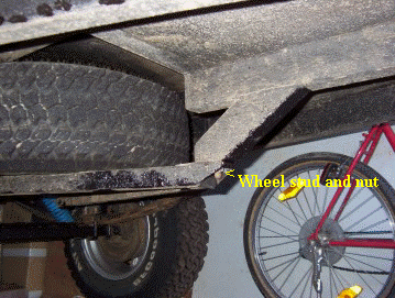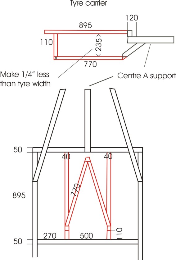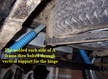 The spare wheel is mounted underneath as helps keep the centre of gravity low and found when on the outside of the trailer anywhere stones would bounce off it back into and breaking the rear window. It also balances out the weight of the water tank when full so the handle is always good with never a problem of sway. It is all made from 40x40x3 SHS tube and is hinged at the back where the end of the support A frame has flat welded to it and a bolt passing through the vertical supports. The front of the A frame had some angle iron welded across the front and gusseted and a tapered hole drilled in. The bottom of the front support has a wheel stud welded inside it to which the front of the A frame attaches using a wheel nut to hold it in place. It works really well as you have to have got out your wheel brace anyway to change the tyre and the whole A frame lowers down to the ground and become like a ramp when taking out and replace the wheel. The distance between the upper floor supports and the lower A frame is 1/4" less than the tyre width ( this a 30x9.5 tyre so the space was made at 9.25" ) so that it holds it tight and wont move at all.