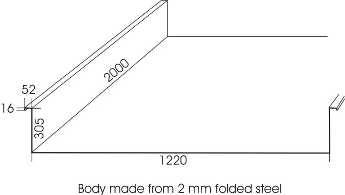 The body is made is made from 2 mm folded steel to the above dimensions.