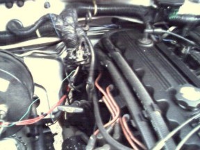 The wiring is fairly straight forward and not as hard as one would think. The black wire from the trip computer goes to the speed pulse wire which I picked up at the top of the firewall and on the XJ '95's I have done was a white wire with an orange stripe, ( left picture above dip stick ). I had located this by following the wires from the speedo drive at the transfer case and then jacked up the rear wheels and had someone turn them while I probed the speedo wires until I found the one that pulsed with my multimeter. The brown wire from the trip computer goes to the injector and you just connect to the wire which is not common among the others which in my case is light green with a black stripe, ( right picture next to pcv valve ). It does not matter which one of the injectors you choose so I used the one closest to the firewall. For the remaining wires I tapped them all into the plug that went to the door buzzer module which I had disconnected the first day I got the car home. The orange wire goes to permanent 12 volts which was the black with yellow stripe. The green wire goes to ground which connected to the all black wire and the blue wire and white wires I connected to the white with black stripe which was 12 volts accessories. The white wire from the computer can also be connected to the headlight switch so it only dims the display when you have them on but found the display way to bright even in the middle of the day so leave it permanently dimmed by wiring it as shown.