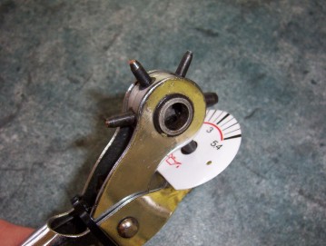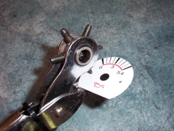 I just cut the gauges out using small scissors as shown above. The black dots are what you have to cut out for the screw, light and needle rests. I just used a hole punch that is used for putting holes in leather belts and such.