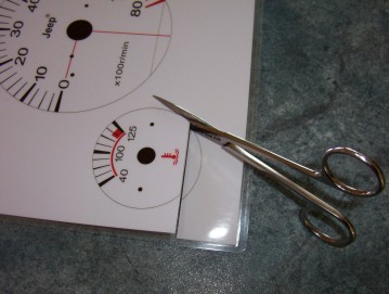 To get the needles to slide over the smaller gauges you will have to trim the short end of the needle with some toenail clippers until they are 1/4" long from the pivot point (the black stripe on top of the needle will end up 1/4" long). They are then in the same proportion as the larger gauges and look better anyway. Remove the screws that hold the back plates in place before sliding the backgrounds over, as this will look better as well as extra holding strength. I used a glue stick that would glue both to metal and paper and was called UHU power stic when I used the photo paper but if laminating, it is easier just to put on drops of super glue on the face like shown above. Any glue or even silicon that will stick to these surfaces should be alright.