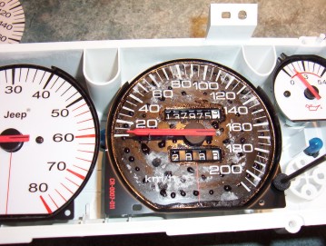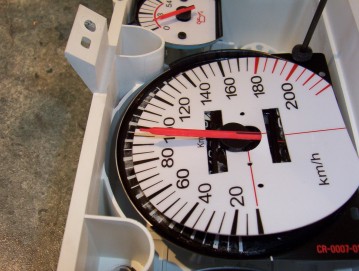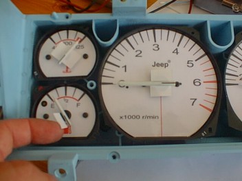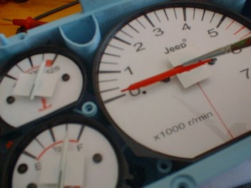 Now remember that YOU WILL NOT NEED TO REMOVE THE NEEDLES to put on the new backgrounds ( removing them can damage the gauge and you have no way of knowing what position to put them back on as they are not indexed ). To put them on you slide it with the trailing edge under the needle like shown above left. Once you get that far you tuck the trailing end of the hole underneath as shown above right.