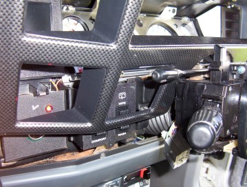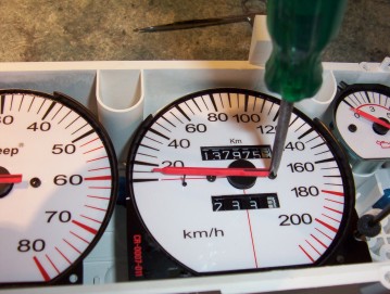 It will now unclip by pulling on it in different places until it is free. You will have to flex it over the back of the column while pushing down while pulling forward on the top to get the top deep section out. To get the clear gauge cover off you first remove the trip reset button by just pulling on it while holding onto the shaft. Then four gold coloured screws are all that remain to get the clear plastic and the surround off. You can remove that cluster if you like with another four screws and un-plugging it but I have done them both in and out before.