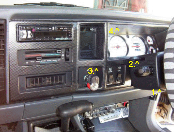 Remove the column surround first if you have a 95 or later ( non airbags models don't need to do this step ) by undoing the three torx head screws underneath ( 1. ) and unscrewing the tilt adjustment lever ( 2. ). Then unplug the column wires as shown above on the right photo by undoing the screw which holds it in place. The plastic dash face is held in with four screws, ( No.3 & 4. both sides ) two above the instruments and one each above the cigarette lighter and headlight switch.