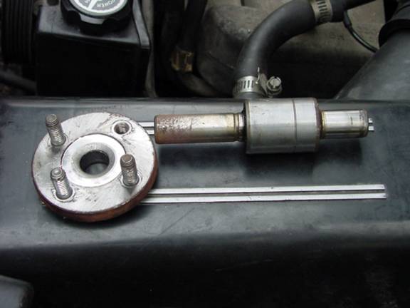 I am not normally a fabricator ( although I have done some in the past ) so it took me some time to decide how to mount the fan due to its large size but once I had the concept in my head I followed a clear path to completion, its not hard but does take some time and tools. I used a 5/16 wrench for the MAIN and AUX fan shrouds and removed them. I then took the old fan blade off with a 10mm wrench. I found my belt adjustment on the power steering bracket (I have a 95) and I removed the belt. Next I removed the A/C from its mount. The next step is to remove the A/C bracket and rent a puller and pull the fan mount off the shaft. Once you do that you drive the bearing and shaft out the back from the front.