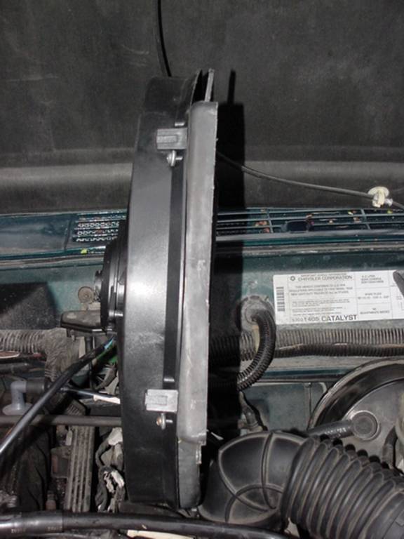 As you can see in order to mount right in the shroud it also overhangs a bit at the bottom and sides; I think calking would clear up this problem but since it is in the radiator air stream I decided to let it go and just worry about the top.