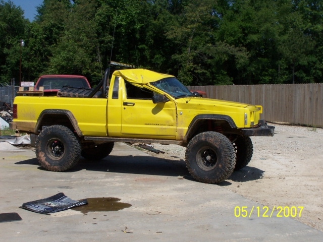 But... I was playing a bit too hard back in April and I flipped it in the gravel pits. Friends said I got drunk and crushed the wrong can, but I don't think that's how it happened. :-) So the insurance company didn't have a clue what to do with how to handle my claim due to all the conversions. They ended up just cutting me a check, letting me keep the Jeep and go about repairing it in my own little way. I bought a 1986 LWB parts Comanche and removed the cab from it in all the factory spot welds.